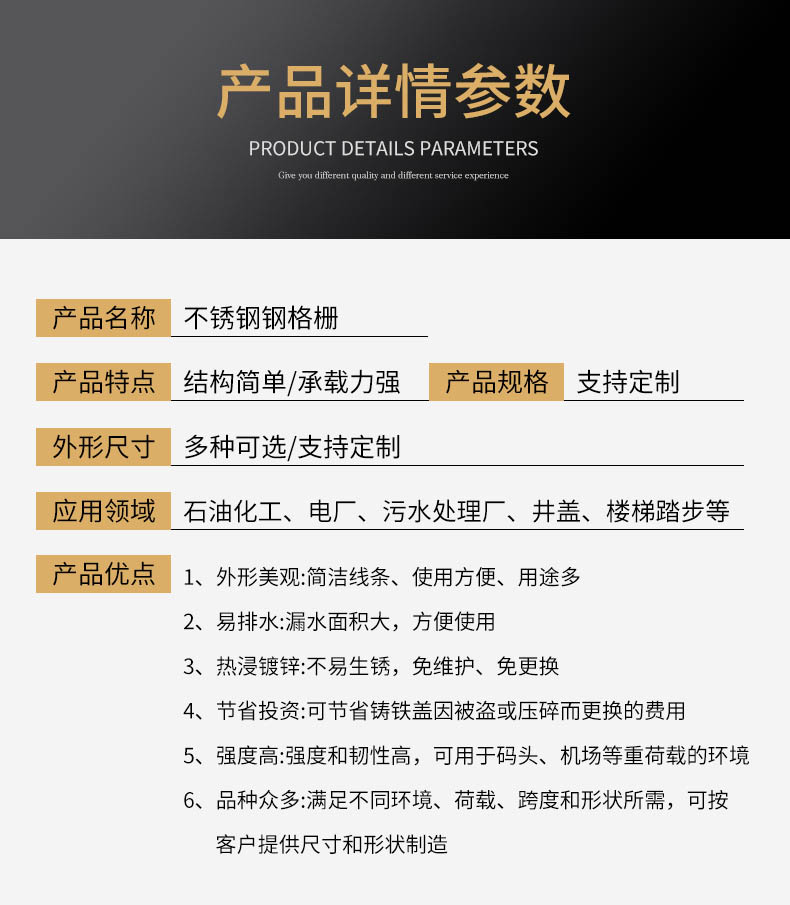 不锈钢钢格栅长处:重量轻、强度高、承载才能大、省材经济、通风透光、现代气度、外形漂亮、防滑安全、易于打扫、装置简洁、经久耐用。
